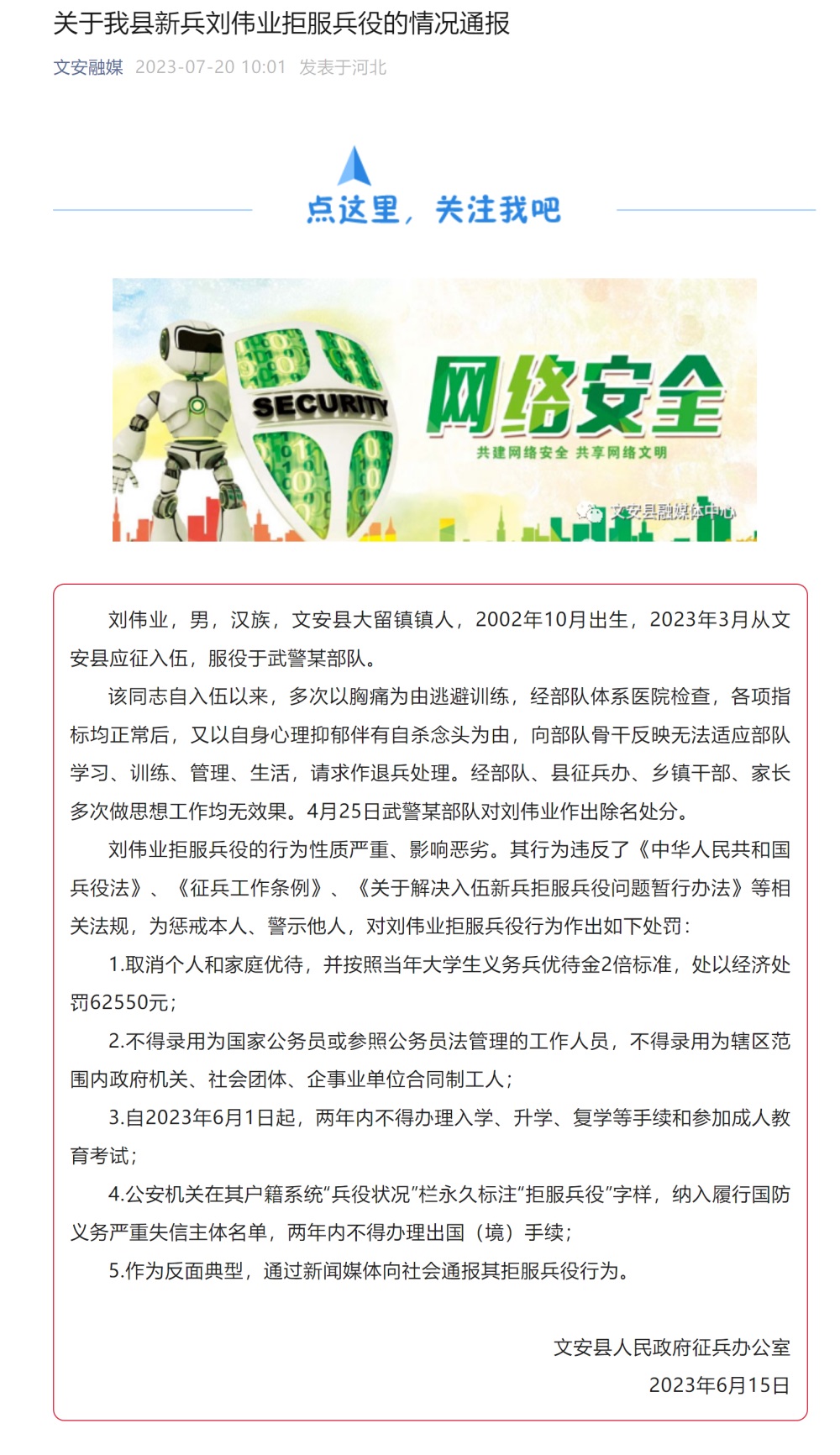 据“文安融媒”微信公众号7月20日消息:河北省廊坊市文安县人民政府征兵办公室日前发布《关于我县新兵刘伟业拒服兵役的情况通报》。通报提出,刘伟业2023年3月应征入伍,服役于武警某部队,自入伍以来,多次以胸痛为由逃避训练,经部队体系医院检查,各项指标均正常后,又以自身心理抑郁伴有自杀念头为由,向部队骨干反映无法适应部队学习、训练、管理、生活,请求作退兵处理。经部队、县征兵办、乡镇干部、家长多次做思想工作均无效果。4月25日武警某部队对刘伟业作出除名处分。其行为性质严重、影响恶劣,违反了多项相关法规,对其作出经济处罚62550元、不得录用为国家公务员或参照公务员法管理的工作人员、公安机关在其户籍系统“兵役状况”栏永久标注“拒服兵役”字样等5项处罚。