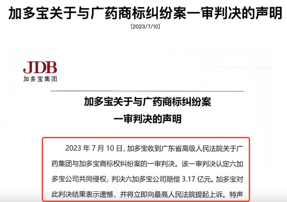 根据声明,7月10日,加多宝收到广东省高级人民法院关于广药集团与加多宝商标纠纷案的一审判决。该一审判决认定,六家加多宝公司共同侵权,判决加多宝公司赔偿3.17亿元。对此,加多宝表示,将立即向最高人民法院提起上诉,坚决维护自身的合法权益。