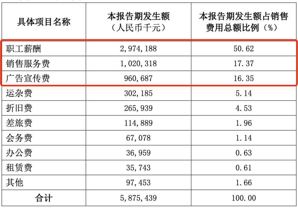 其实,翻开白云山的财报不难发现,职工薪酬、销售服务费和广告营销费用一直高居不下。据2022年年报,白云山的销售费用高达58.7亿元,其中,销售职工薪酬29.74亿元,占比达50.62%。此外,白云山的销售服务费为10.2亿元,占销售费用的17.37;广告宣传费用达9.6亿元,占销售费用的16.35%。