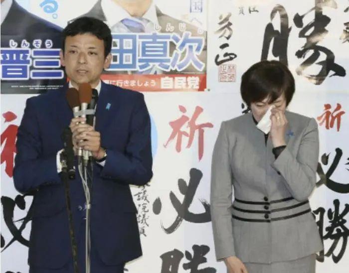 ·吉田真次和安倍昭惠向支持者发表讲话,期间,安倍昭惠泪洒现场。