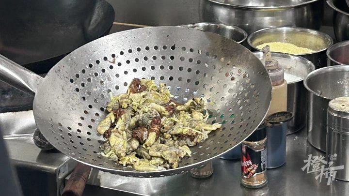 起锅烧油,之后拿出些焯过水的知了,此时的知了还是软趴趴的。“不能用大火,大火会把知了炸黑,油要多,油温不能高,油温高了知了就会碎掉,低温时候就放下去炸,才能保证炸得又酥又脆还不碎。”