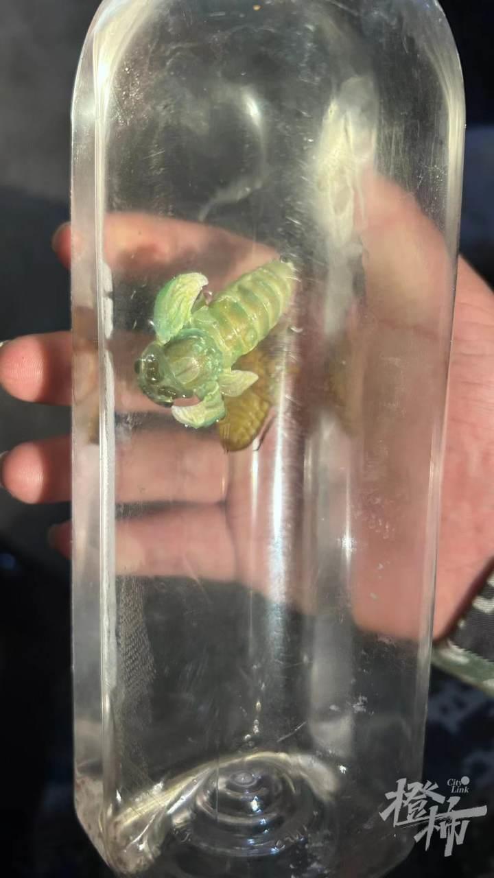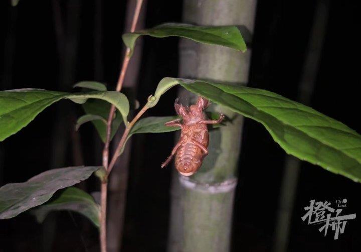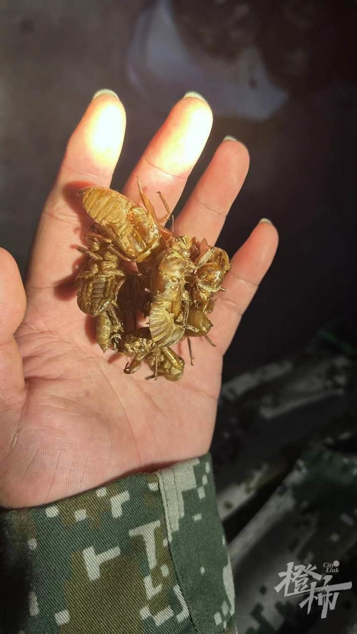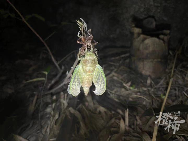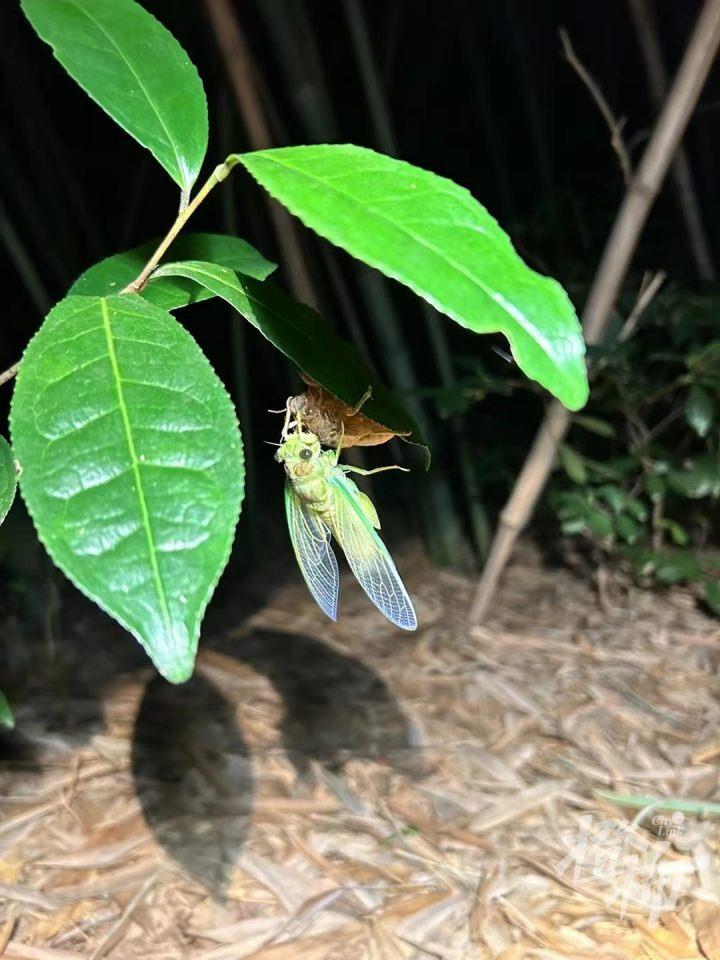 小高抓到的这只知了,浑身呈青绿色,挂在刚蜕完的蝉壳上,摸起来非常柔软,还带点弹性。“这片地方有人来过了,今天晚上的收获可能很少咯。”