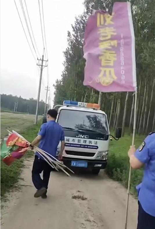 城管执法人员来田间将广告旗、条幅撕掉收走