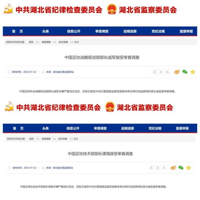 7月22日,湖北省纪委监委发布通报:中国足球协会战略规划部部长戚军、技术部部长谭海涉嫌严重违纪违法,目前正接受中央纪委国家监委驻国家体育总局纪检监察组和湖北省监委审查调查。