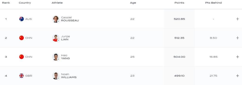 最后一跳练俊杰和杨昊都是109C,难度系数3.7。练俊杰最后一跳获得了98.05分的高分,总成绩定格在了512.35分。杨昊最后一跳获得了94.35分,总成绩504.00分完成了全部比赛,两人分别获得了该项目的银牌和铜牌,澳大利亚选手卢梭以520.85分拿到金牌。