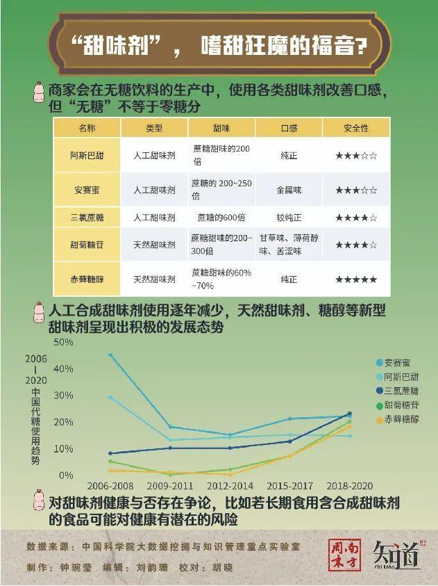 同时,“无糖”“零糖”食品的流行引起人们对“0糖”标识与各甜味剂的讨论。比如对于代糖,中科院报告指出,天然甜味剂的市场占比正在逐年提升,相比之下,阿斯巴甜等人工甜味剂因为安全性存疑,正在被天然甜味剂取代。