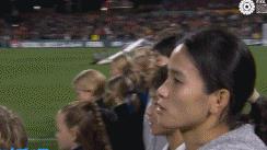 比赛开始前,女足队员们唱国歌和合影。场边的水庆霞指导眼含热泪跟唱,令人动容。