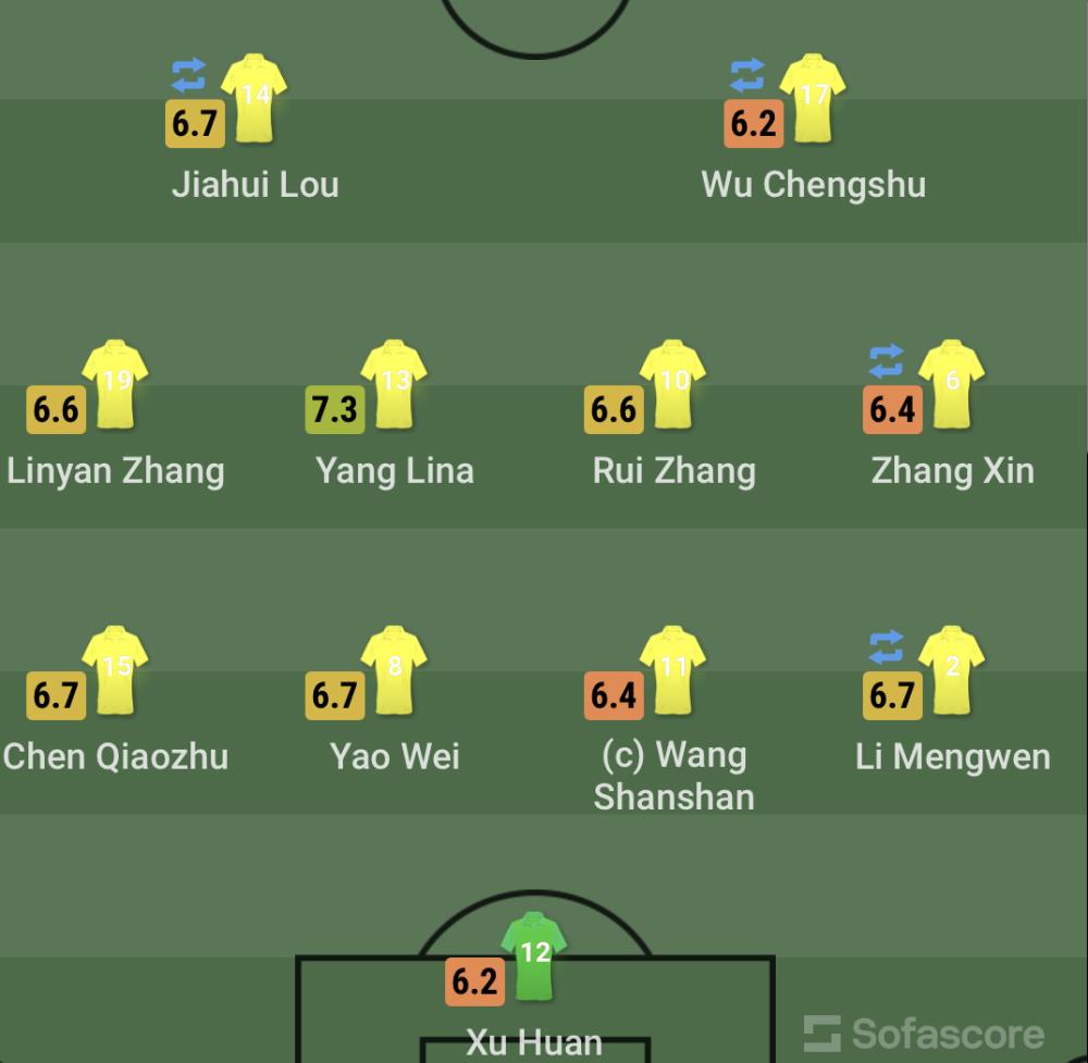 后卫:2-李梦雯(84'23-高晨)、11-王珊珊、8-姚伟、15-陈巧珠