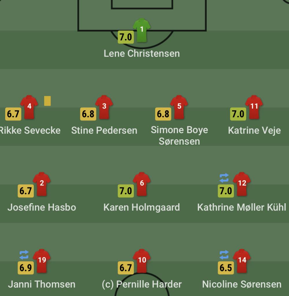 中场:2-约瑟芬-哈斯博、6-卡伦-霍尔姆高、12-屈尔(62'20-布鲁恩)、14-尼科琳-瑟伦森(72'17-马森)