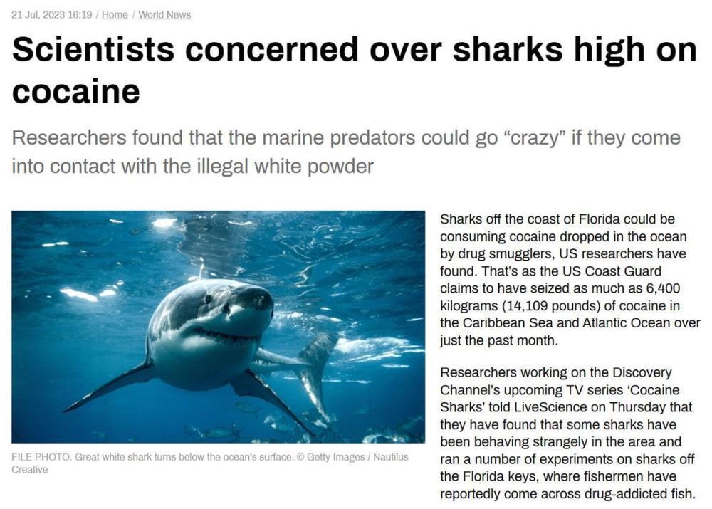 综合《每日邮报》、“今日俄罗斯”(RT)等媒体7月21日报道,近日,美国海洋生物学家警告称,美国佛罗里达州海岸附近的鲨鱼可能正在吸食被遗弃在海中的可卡因。