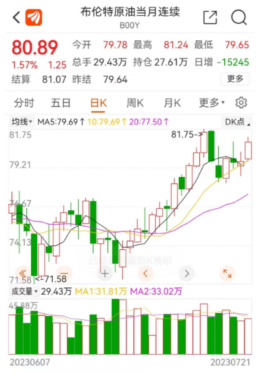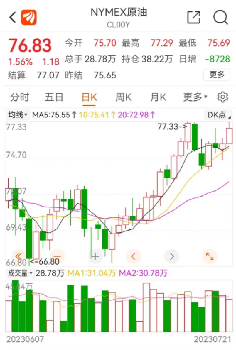截至7月21日收盘,纽约商品交易所9月交货的轻质原油期货价格收于每桶77.07美元,涨幅为1.88%;9月交货的伦敦布伦特原油期货价格收于每桶81.07美元,涨幅为1.80%。