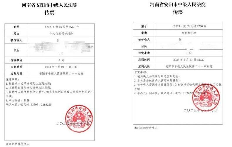名誉权纠纷和个人信息保护纠纷两个案件的法院传票