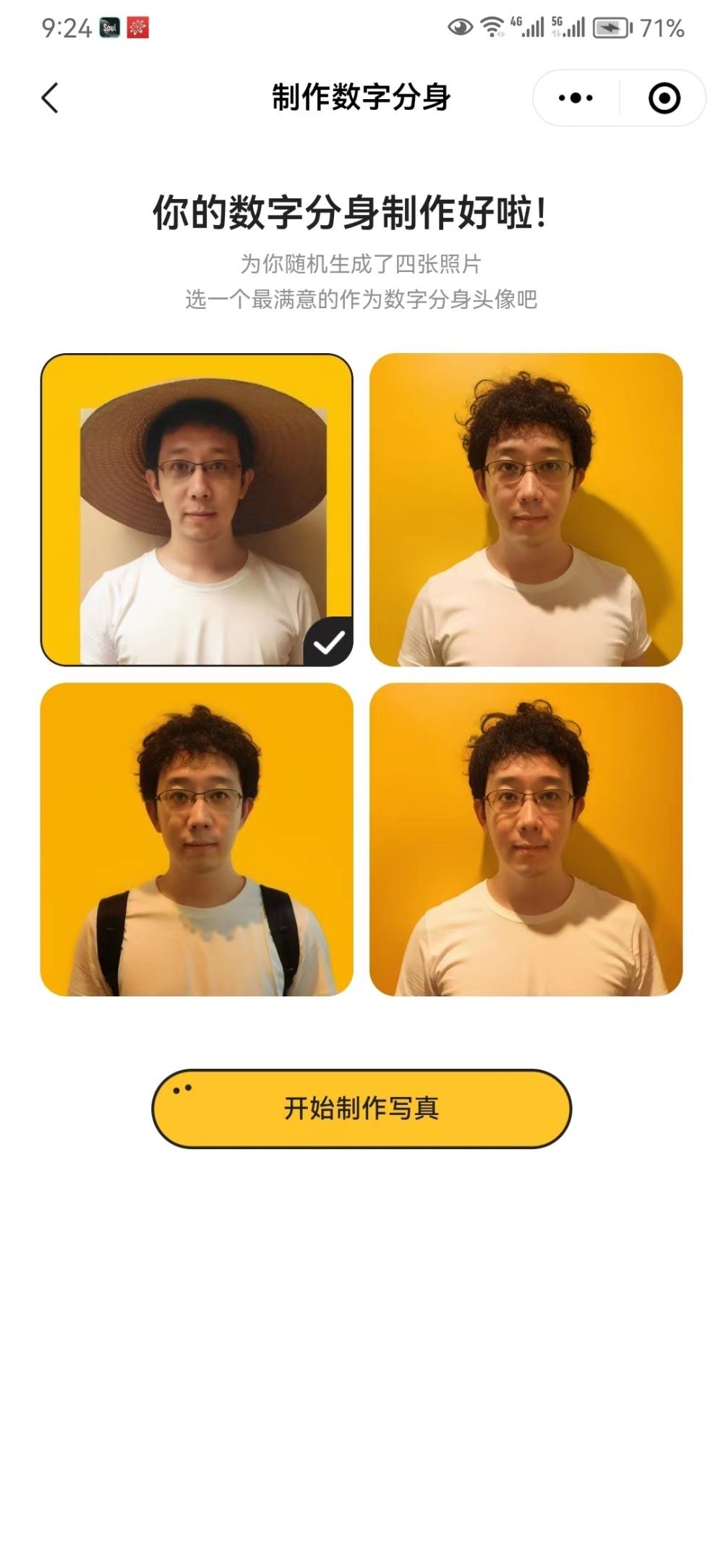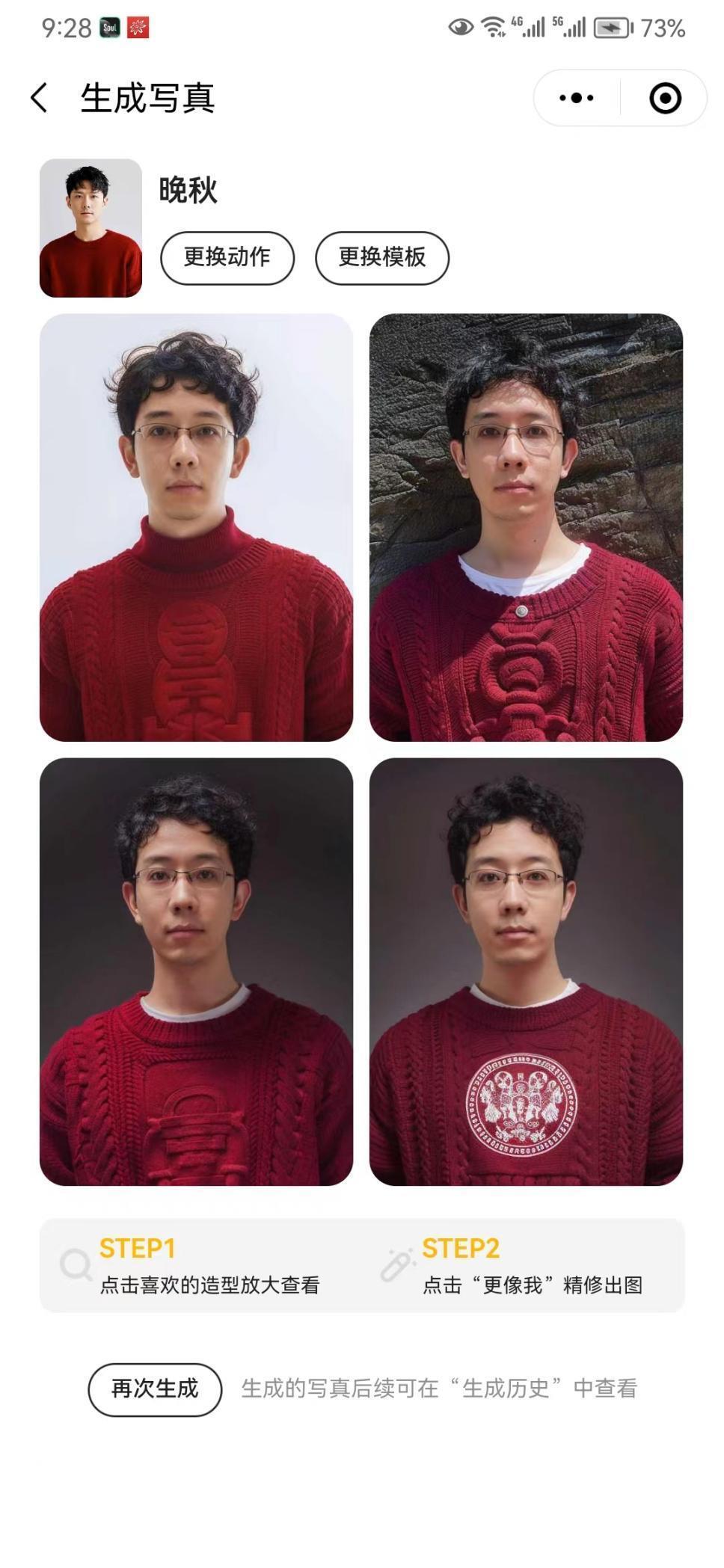 数字分身制作完成后,就可以使用该应用中的“生成写真”功能。该应用提供了不少已经拍摄完毕的照片,风格各异,用户可以选择参考其中的某种照片风格,再要求自己的数字分身按照该风格“生成”一张自己的照片,如记者选择“晚秋”风格后,很快生成了四张照片。此外,如果对生成结果不满意,该应用还提供了一个选项:“我想更像我一点”,点击后即可重新生成。