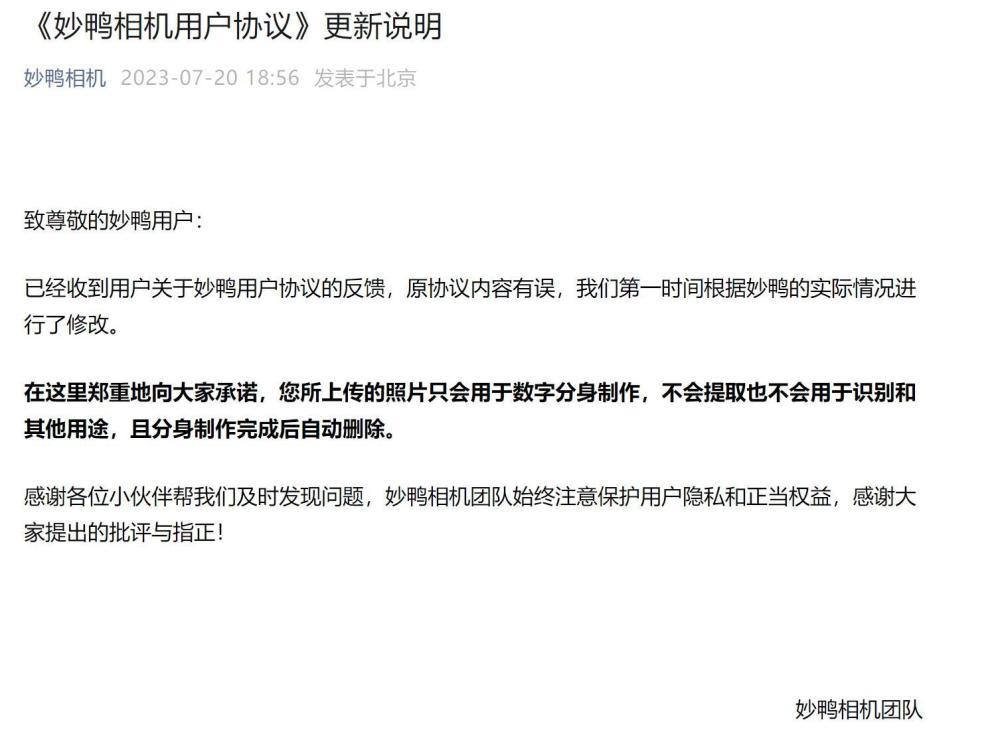 妙鸭相机团队声明