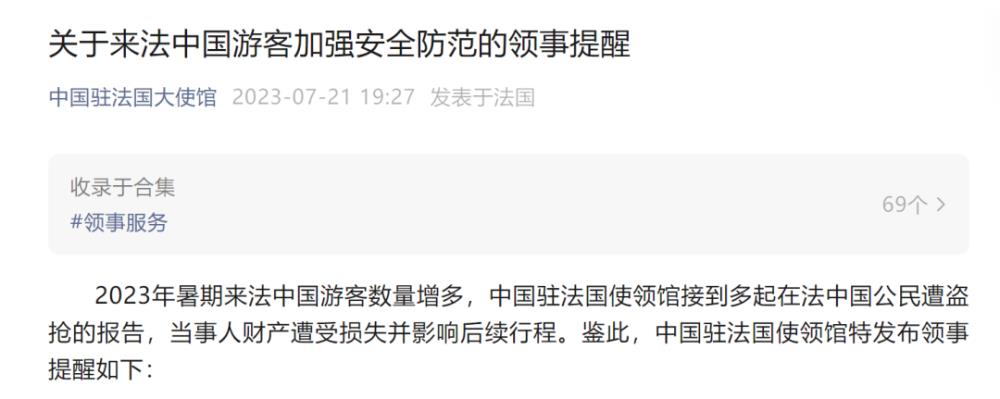 无独有偶,7月21日,中国驻法国大使馆发布关于来法中国游客加强安全防范的领事提醒。全文如下:
