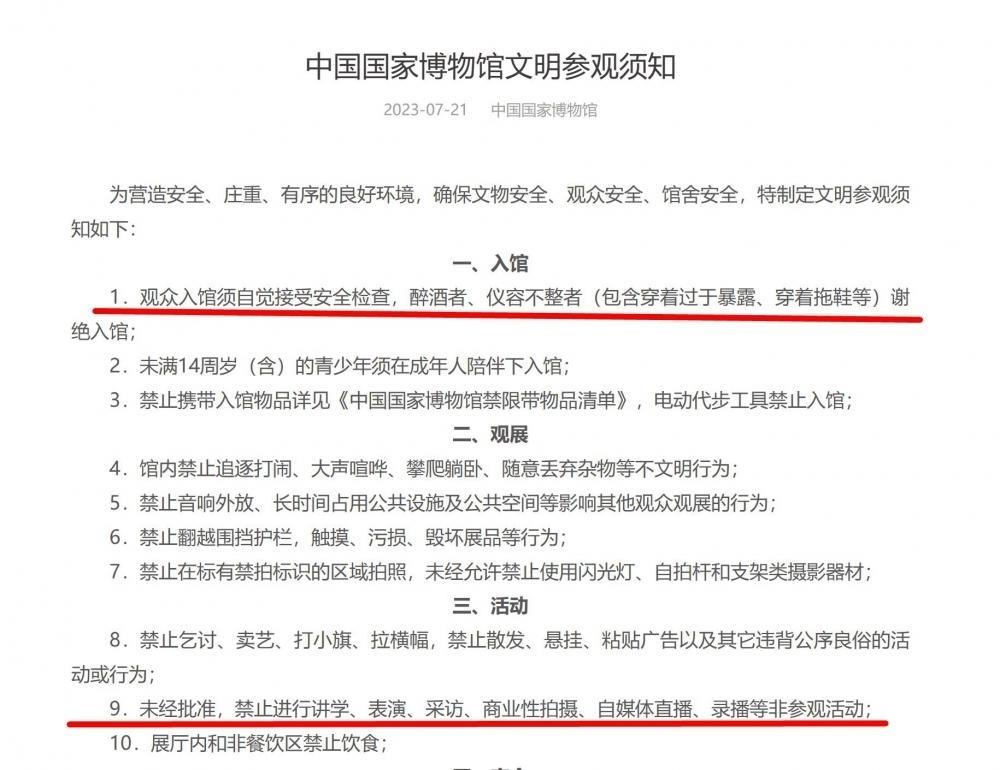 据央广网消息,7月22日,中国国家博物馆(国博)发布《文明参观须知》,其中提出:未经批准,禁止进行讲学、表演、采访、商业性拍摄、自媒体直播、录播等非参观活动;仪容不整者(包含穿着过于暴露、穿着拖鞋等)谢绝入馆。“国博禁止私自商拍自媒体直播”“国博禁止穿拖鞋、衣着暴露者入内”等话题迅速冲上热搜,引发各界广泛关注。