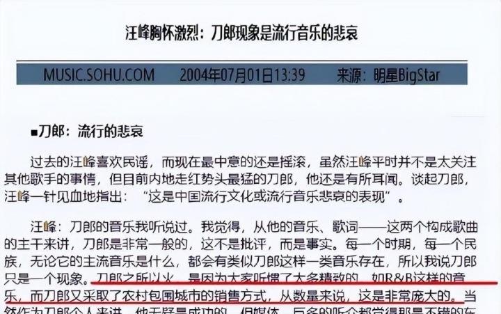 汪峰也表示:“我不认为刀郎是一个好歌手,也不认为他是一个好词作者。我认为他只是一个会抓住时机、会利用网络平台、会迎合大众心理的商人。他的歌曲没有任何的艺术价值,只是一种低级的娱乐。他的歌词没有任何的深度和内涵,只是一些肤浅的感情表达。他的旋律没有任何的创新和突破,只是一些老套的模式和公式。他的声音没有任何的特色和魅力,只是一种平淡的嗓音。他不配被称为一个音乐人,更不配被称为一个艺术家。”