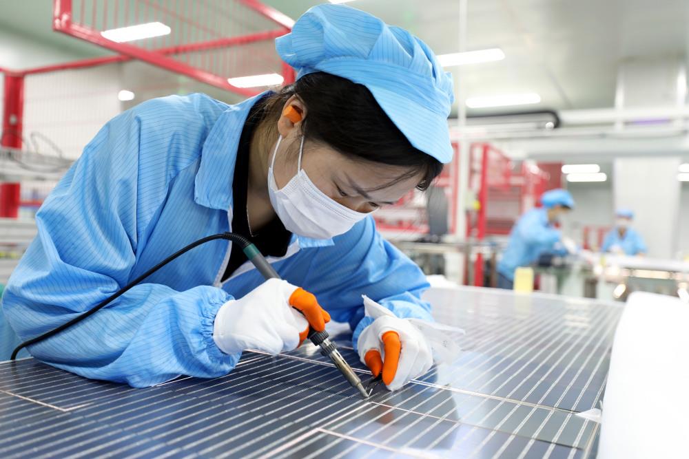 2023年7月22日,安徽省淮北市,烈山经济开发区一家新能源生产企业车间生产线上,工人正在赶制出口太阳能光伏组件。(IC photo)