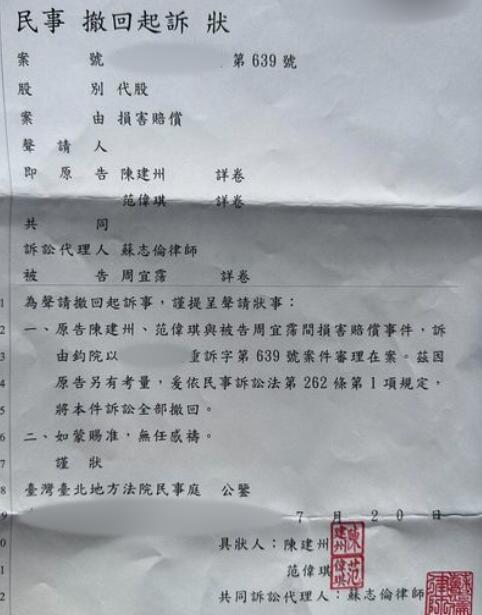 对此,陈建州经纪人回应:听从律师建议,提出刑事控诉才撤销民事诉讼。
