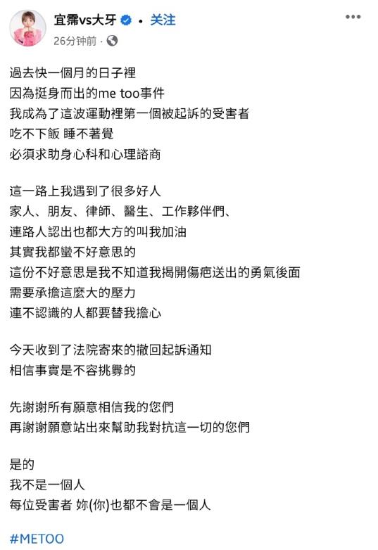 大牙表示在7月24日收到法院的通知,相信事实是不容挑衅的,感谢一直以来相信她的粉丝,作为第一个被起诉的性骚扰风波受害者,大牙认为自己不是一个人在战斗,那些受害女星也不是一个人在战斗。