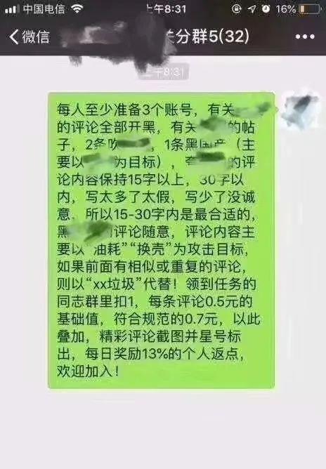 除了汽车品牌亲自下场外,很多专业的营销团队也会参与其中,另一位资深水军表示:“上大学赚零花钱找到了水军,拉我进群的应该是专业的团队,而不是某一个品牌的人,比如说他们可能会黑比亚迪,但同时也会帮忙发布比亚迪正面的帖子,什么单子都会接,只要给钱就干,他们只是做一下分发,我们拿到钱就行,别的也管不了那么多。
