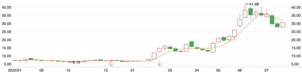 ▲(鸿博股份近一年股价周K线。图源/同花顺)