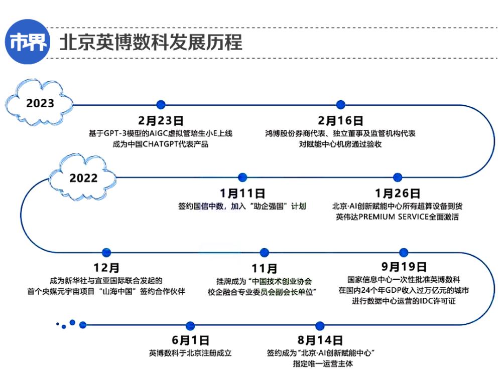 这一切都是因为鸿博股份在2022年6月份成立的全资子公司英博数科——后者在2022年8月份宣布,与全球AI算力芯片龙头英伟达达成了深度合作,共同建设北京AI创新赋能中心(下称“赋能中心”),开展基于英伟达芯片的算力租赁业务。