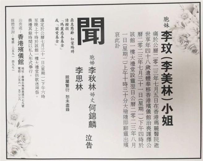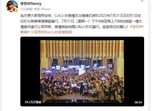 7月14日晚,李玟二姐李思林发文表示,李玟的丧礼及出殡仪式将于2023年7月31日及8月1日在位于北角的香港殡仪馆举行。