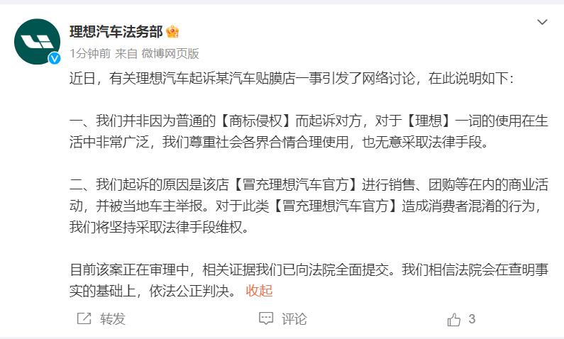 7月24日,据理想汽车法务部:近日,有关理想汽车起诉某汽车贴膜店一事引发了网络讨论,在此说明如下: