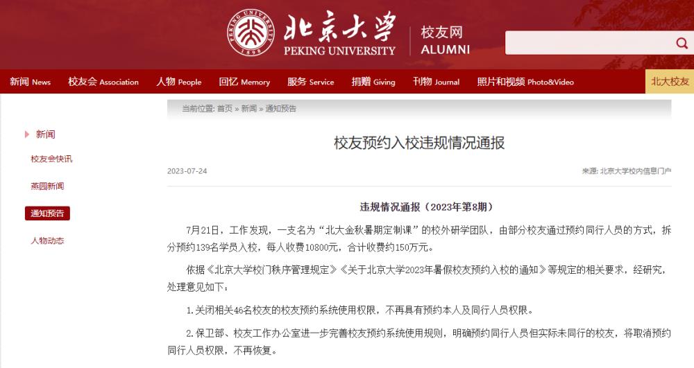 7月24日,北京大学发布《校友预约入校违规情况通报》。通报称,7月21日,一个名为“北大金秋暑期定制课”的校外研学团队,由部分校友通过预约同行人员的方式,拆分预约139名学员入校,每人收费10800元,合计收费约150万元。