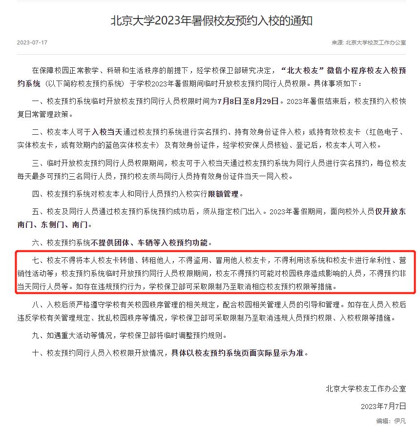 通报称,依据《北京大学校门秩序管理规定》《关于北京大学2023年暑假校友预约入校的通知》等规定的相关要求,北京大学将关闭相关46名校友的校友预约系统使用权限,不再具有预约本人及同行人员权限。