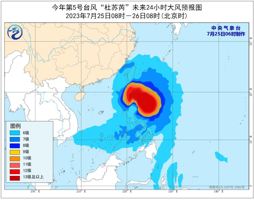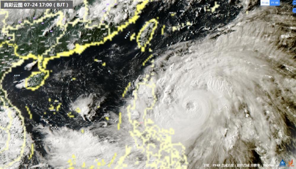 今年第5号台风“杜苏芮”24日夜间加强为超强台风级。今天(25日)早晨5点钟其中心位于我国台湾省鹅銮鼻东南方大约670公里的菲律宾吕宋岛以东洋面上,就是北纬17.2度、东经124.9度,中心附近最大风力有17级(58米/秒),中心最低气压925百帕,七级风圈半径300-450公里,十级风圈半径120-180公里,十二级风圈半径90-120公里。
