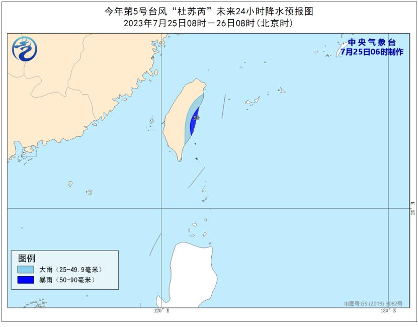 25日08时至26日08时,台湾岛东部有大雨,部分地区暴雨(50-90毫米)。