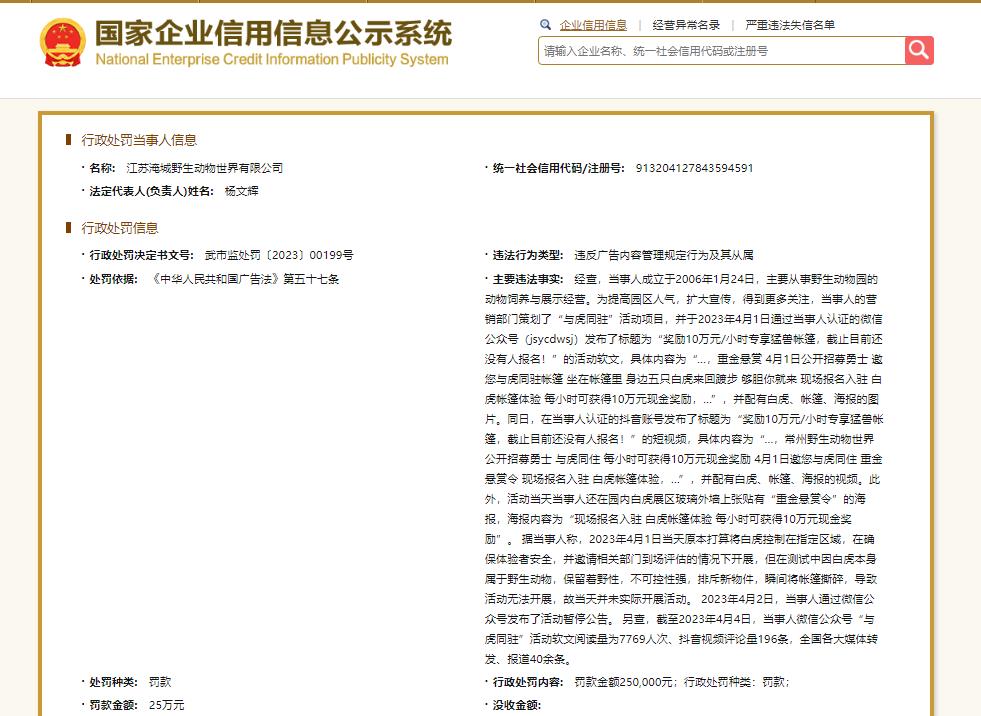 据悉,主要违法事实显示,2023年4月1日,当事人的微信公众号发布了活动软文,具体内容包括为“重金悬赏 4月1日公开招募勇士 邀您与虎同驻帐篷 坐在帐篷里 身边五只白虎来回踱步 够胆你就来 现场报名入驻 白虎帐篷体验 每小时可获得10万元现金奖励”。同日,当事人的抖音账号也发布了包含类似内容的短视频。