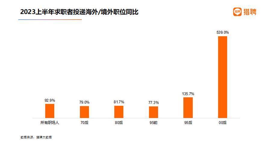 在人才出海、出境就业方面,猎聘发布的报告称,随着去年底疫情管控措施的放开,人才跨区域、跨境恢复往日的便利。2023上半年求职者投递海外/境外职位同比去年同期增长92.9%。