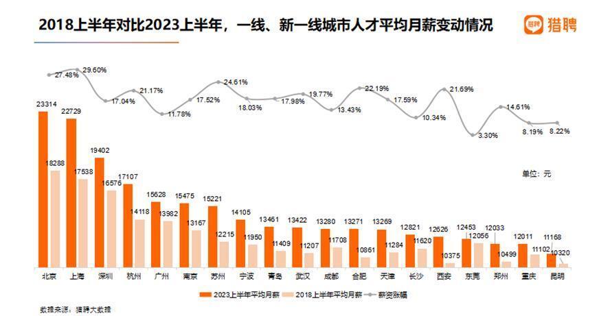 中新经纬7月25日电 日前,同道猎聘旗下猎聘发布《2023上半年人才流动与薪酬趋势报告》,报告显示,从2023年上半年趋势来看,越来越多的年轻人正涌向新一线城市。2023年人才投递热门城市前三分别为上海、北京和深圳。薪资方面,北京平均月薪18976元全国最高,而上海近六年来薪资涨幅最高,达29.6%。