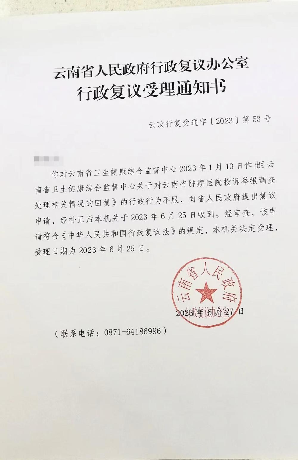 因对云南省卫生健康综合监督中心2023年1月13日作出的行政行为不服,王卫东的家属向云南省人民政府行政复议办公室提起了行政复议。6月27日,该机关出具的通知书显示,该机关已决定受理。