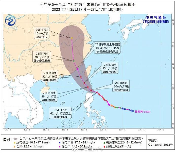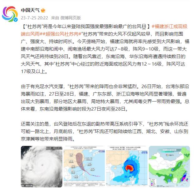 据@中国天气 微博7月25日消息,“杜苏芮”带来的大风不仅起风较早,而且影响范围广、强度大、持续时间长。今天傍晚开始,福建沿海就将率先感受到大风影响,福建中南部沿海和闽中、闽南渔场最大风力可达7~8级,阵风9~10级,而这一带大风天气还将持续到28日。随着台风靠近,东南沿海、华东沿海将遭遇持续数日的大风天气,其中“杜苏芮”中心经过的附近海面或地区风力有12~16级,阵风可达17级及以上。