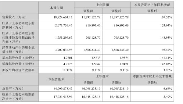 此外,公司上半年扣非净利润175.5亿元,同比增长148.93%,经营活动产生的现金流净额为370.7亿元,公司实现基本每股收益为4.72元,同比增长141.14%。
