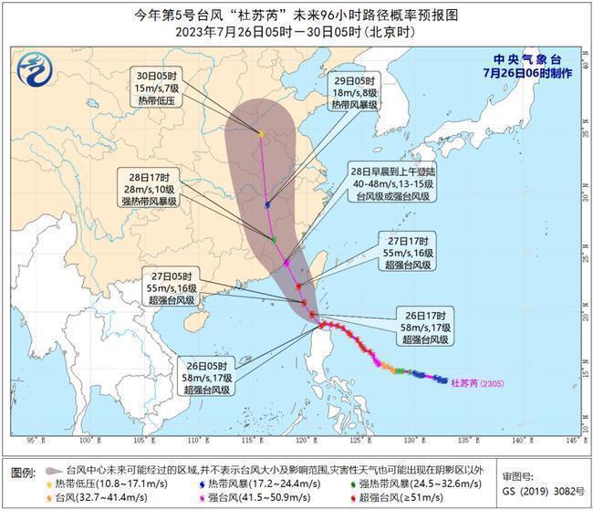 7月26日06时,中央气象台继续发布台风橙色预警和暴雨蓝色预警,“杜苏芮”将于28日早晨到上午登陆我国东南沿海,台湾岛东部局地特大暴雨。