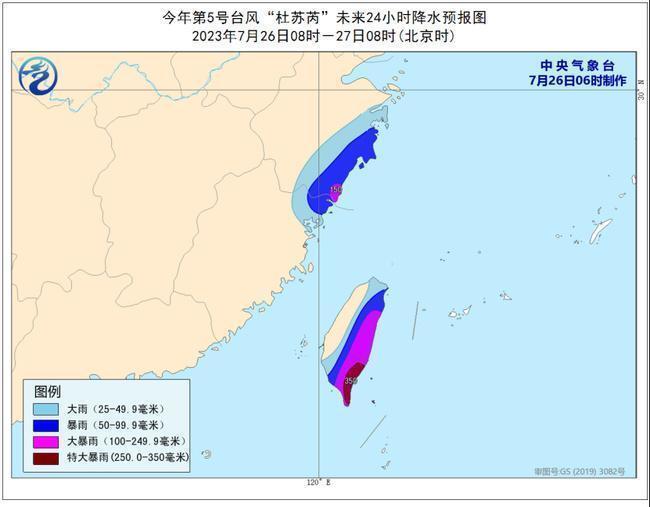 降水预报:26日08时至27日08时,浙江东部、福建东北部、台湾岛中东部有大到暴雨,其中,浙江东南部、台湾岛东部部分地区有大暴雨,台湾岛东部局地特大暴雨(250~350毫米)。