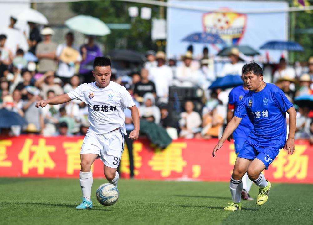 7月15日,六佰塘村足球队球员杨宗维(左)在与月寨村足球队的比赛中带球进攻。 新华社记者 杨文斌 摄