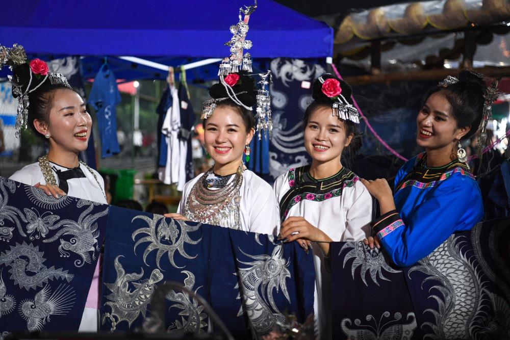 6月30日,村民在贵州“村超”足球赛场旁的文创摊位展示民族服饰。