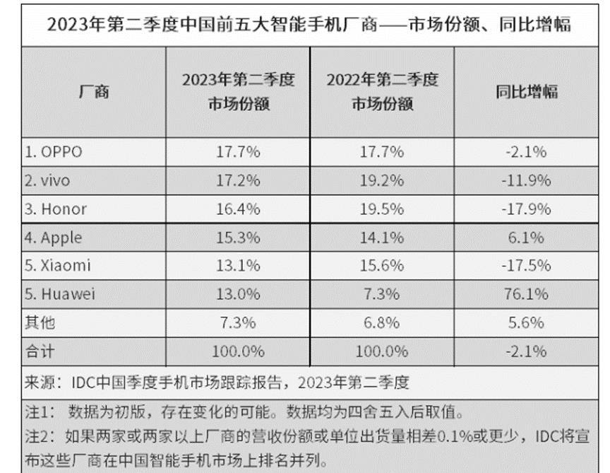 对于OPPO继续占据出货量第一的位置,IDC分析称:“双旗舰Find X6系列和Find N2&Flip系列帮助OPPO在600美元以上高端市场份额进入前三位。Find N2 Flip表现亮眼,成为上半年折叠屏单品第一。同时在400-600美元市场,依靠Reno系列的出色表现,OPPO市场份额优势明显。子品牌一加继续维持高达三位数的同比增幅,市场份额不断提升,帮助OPPO整体市场份额稳步增长。”