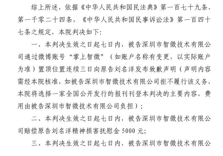 一、本判决生效之日起七日内,被告深圳市智微技术有限公司通过微博账号“掌上智微”(如账户名称有变更,以实际账户为准)置顶位置连续三日向原告刘名洋发布致歉声明(声明内容需经本院核准,如被告深圳市智微技术有限公司拒不履行该义务,本院将选择一家全国公开发行的报刊刊登本判决的主要内容,费用由被告深圳市智微技术有限公司负担);
