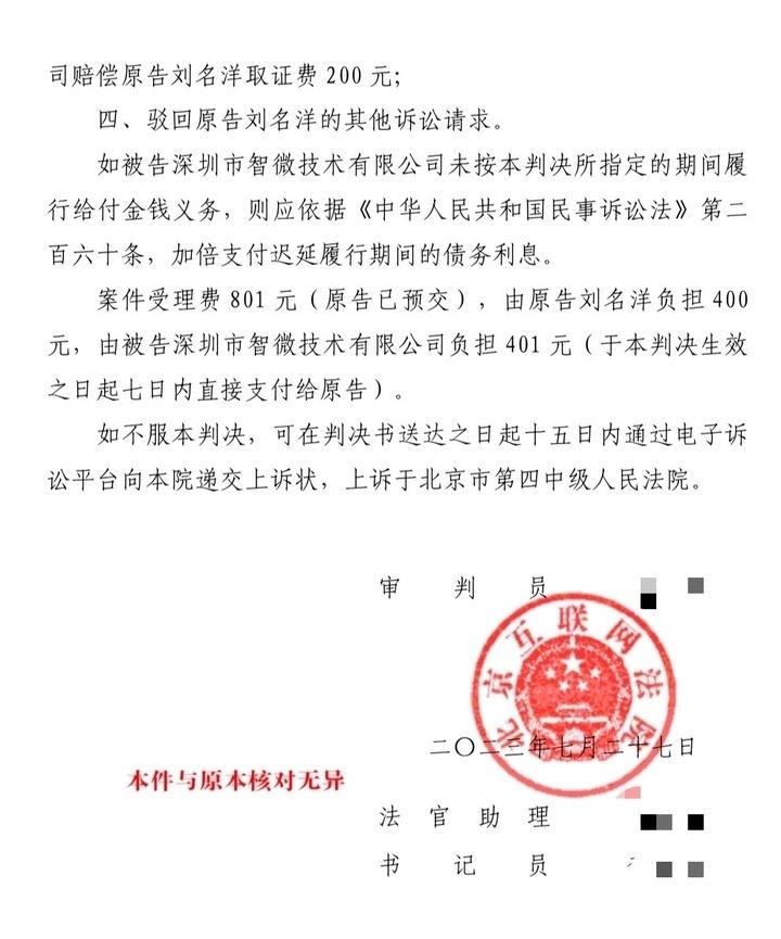 三、本判决生效之日起七日内,被告深圳市智微技术有限公司赔偿原告刘名洋取证费200元;