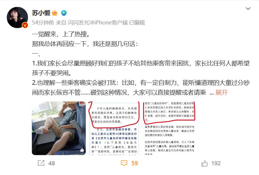 苏小懒又在10点39分更新了一篇长文,对网友的质疑进行了全面回应:苏小懒首先表明了自己的态度——家长比任何人都希望孩子不要哭闹;理解一些乘客确实会被打扰;能感受到乘务员有他们的苦衷;这些都不应该成为高铁乘务成员对所有儿童一视同仁、过分苛责要求的理由。