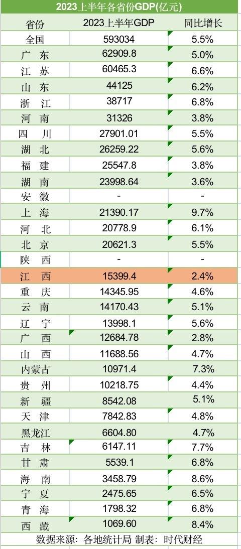 截至7月27日,除安徽、陕西外,其他29个省(自治区、直辖市)均公布了上半年经济数据,其中,14个省份地区生产总值(GDP)增速跑赢5.5%的全国水平。江西意外跌至底部,同比增速仅为2.4%,较全国5.5%的增速低3.1%个百分点,创10年来同期最低增速(除受疫情影响的2020年上半年外)。