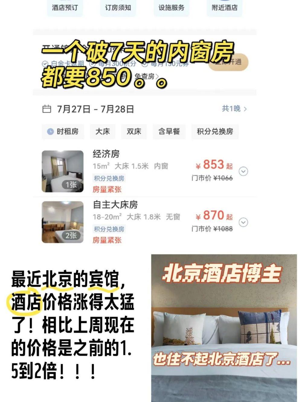 而在社媒平台,相关吐槽声更是不绝于耳。小红书上,有网友表示,已经买了高铁票,搜完目的地酒店价格后,“感觉没有容身之地”,转头把票给退了。还有人说北京一个破7天的内窗房,都要850元。更有酒店博主发文称,自己都要住不起了。微博上也有网友现身说法:7月初,提前预订了北京的一家酒店,580元/天,本想再续一天,价格已经涨到了900多一天。