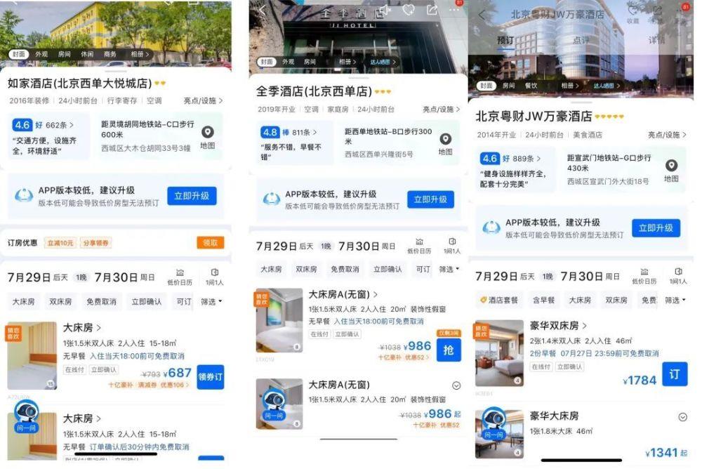 以最近大热的旅游目的地北京为例。「市界」在携程平台搜索看到,北京西单的如家酒店,双休日一间15㎡的客房,价格达到了687元/晚。500米开外,一家定位中档的全季,一晚房价在986元。高档酒店代表——万豪和威斯汀(房间面积均在40㎡以上),一晚房价在1400元左右。